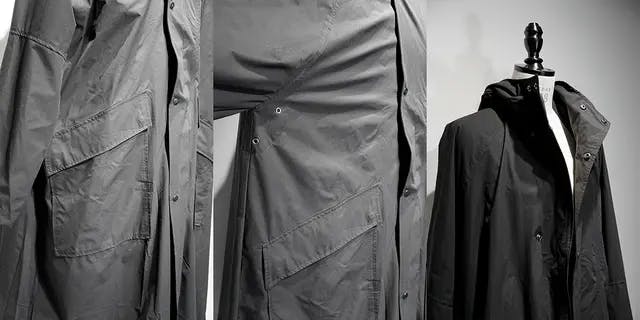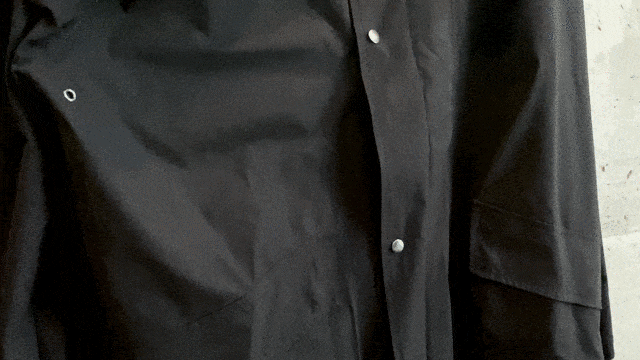 この素材が前作のファティーグパンツ向けのAEROTECTを更にコート向けに軽快にするため、改良検討を重ねて、やっと今日を迎えられました。トウモロコシ由来のBotanicaltech®で軽量且つ強靭なRipstopを作って、更に全天候型の透湿防水シート膜を導入し「AEROTECT」を開発しました。その後コートにした時の重さ、裏側の色がファティーグパンツは白濁色でしたので、パンツでは良かったしっかり感をコート用に黒に軽量&改良しました。