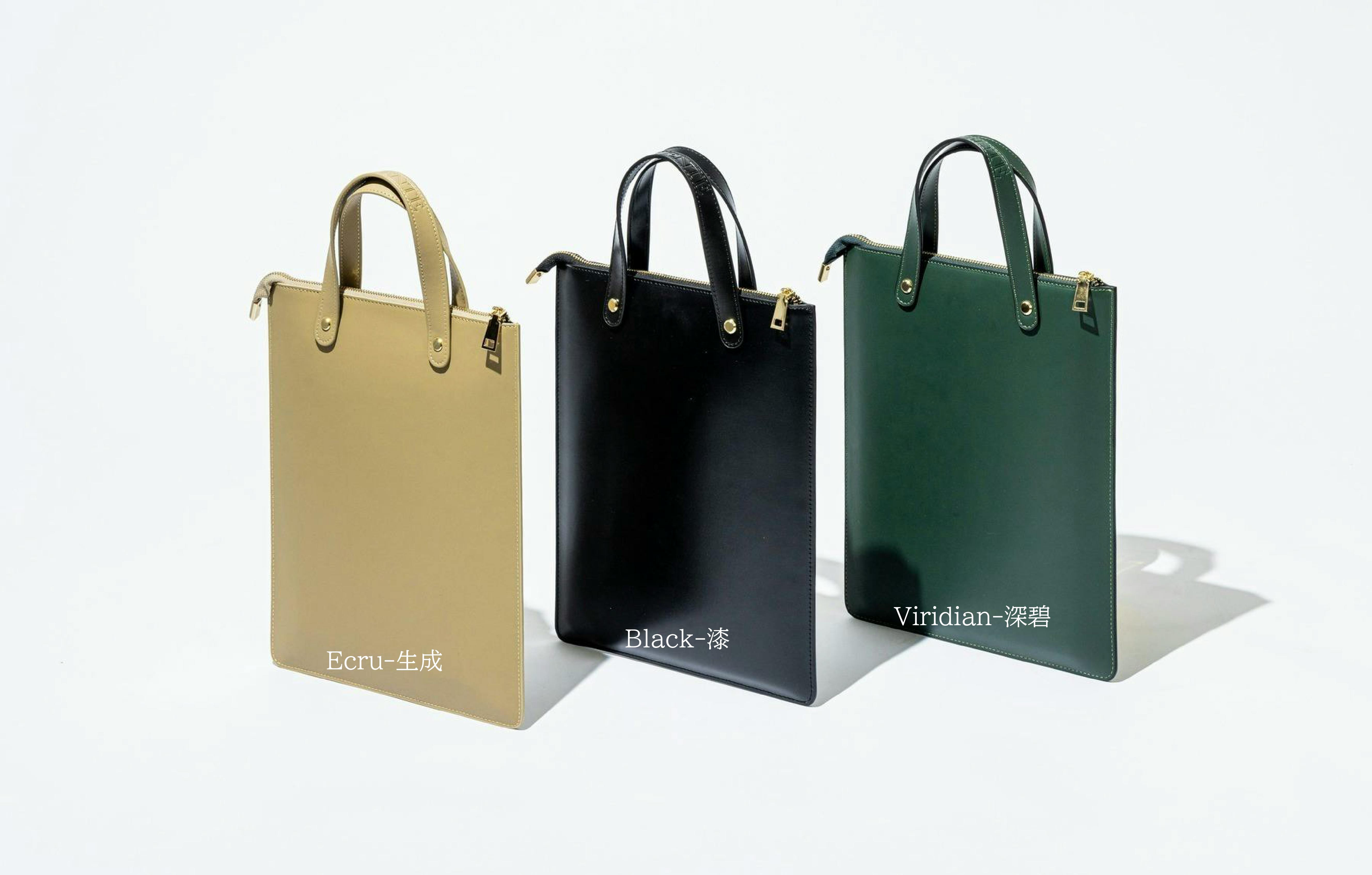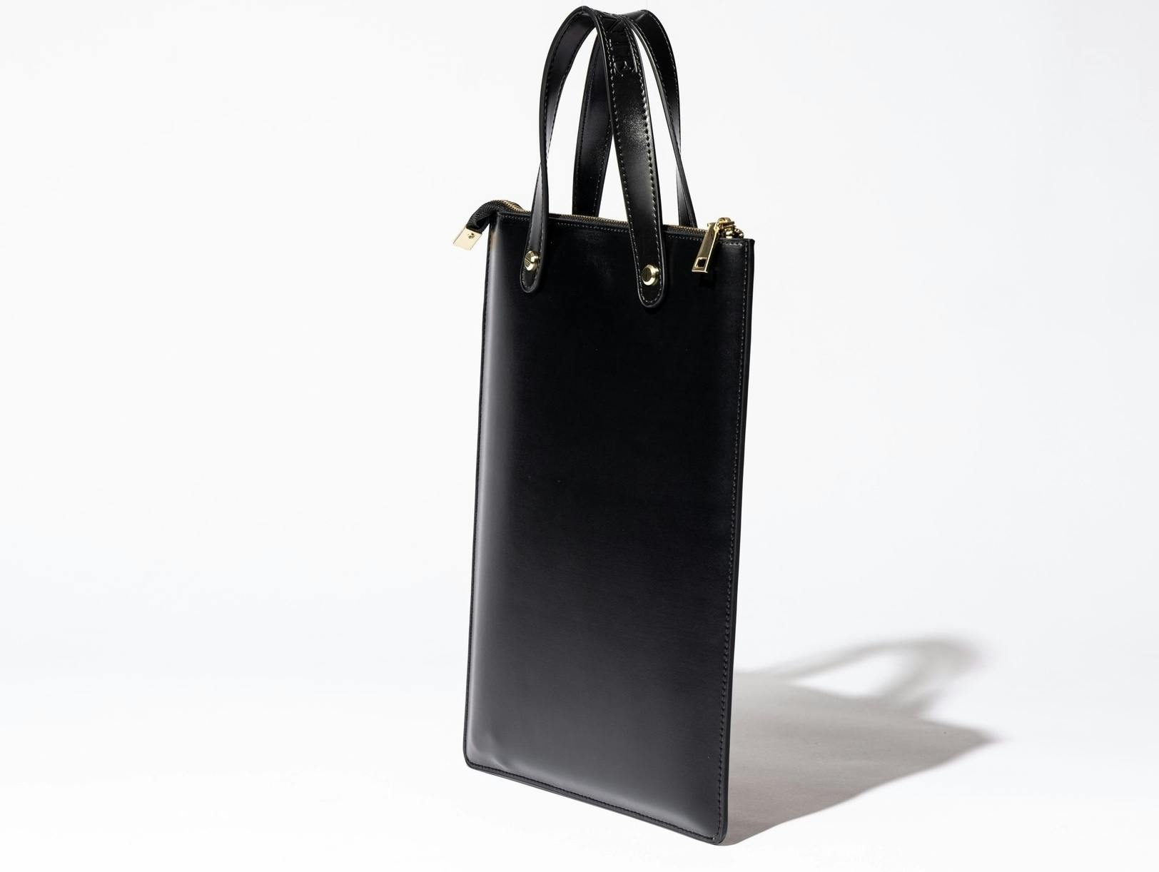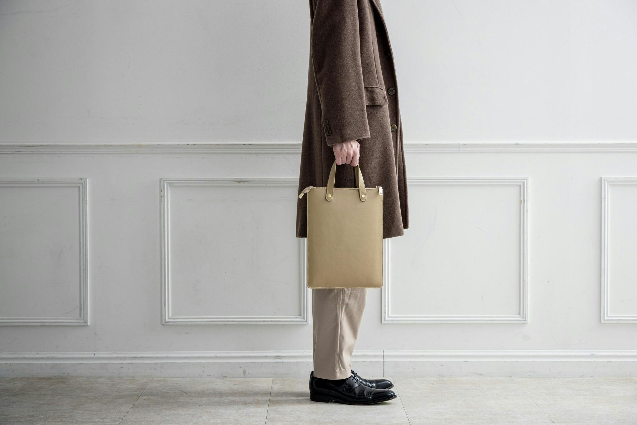 表面に切り替えを作らず、厳選した最低限のパーツのみで組み立てることにより、なめらかな革の質感を存分に味わえる縦型の本革バッグ。