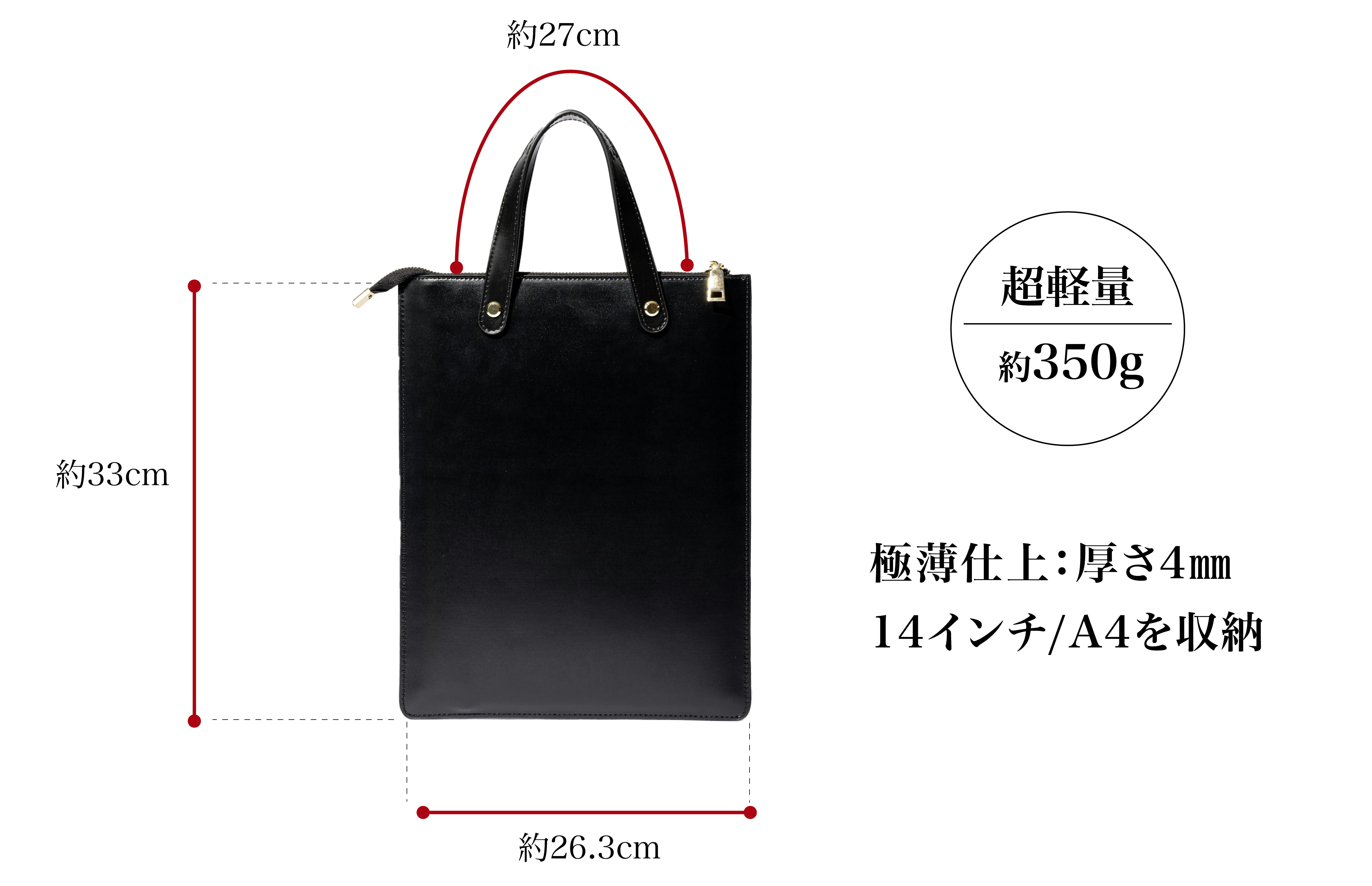 薄型ながら、PCやA4書類、小物も収納でき、ビジネスシーンに必要な利便性も言うことなし。あわせて350g前後という超軽量でありながらも、コシとハリのある上質な本革が荷物をしっかりと保護します。