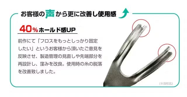 銀歯に引っかかるフロス外れの現象も大幅に軽減。糸固定のボタンも改良し、フロス糸