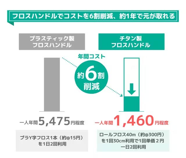 A:上記記事と重なりますが、チタン製フロスは一人年間1,460円程度に対して、プラスティック製フロスは一人年間5,475円程度で、1人当たり年間4,015円程度、約6割ものコスト削減効果があります。