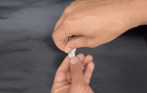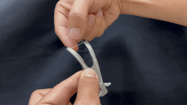 A:ハンドル柄の部分のボタン(円柱の部品)があります。このボタンの下部にあるスキマに1周回してかませるとそのまま固定できます。結んだりは面倒なのでしません。ボタンの隙間に糸をかませるだけで簡単に固定できます。そうして、お好みのテンションでフロス糸を貼って頂きフロス磨きをしていただけます。