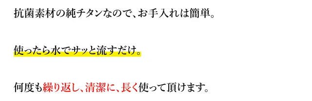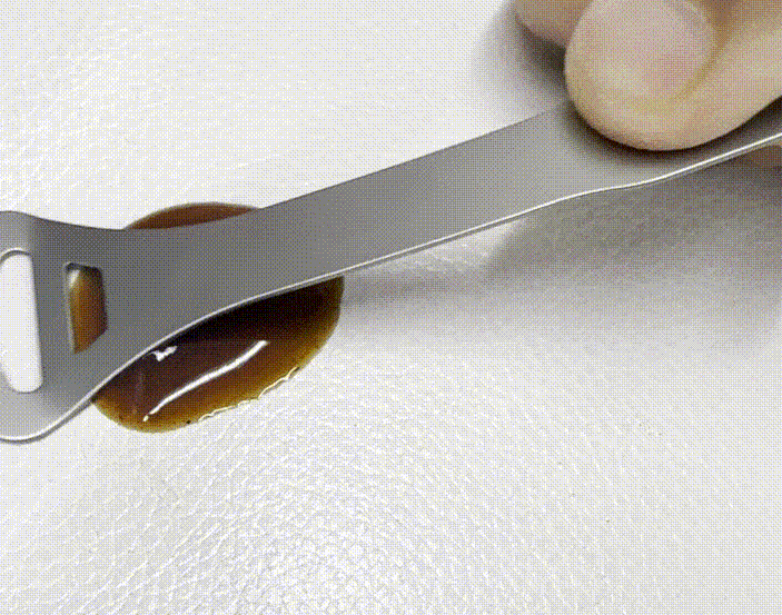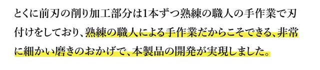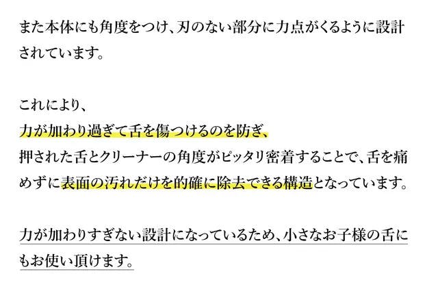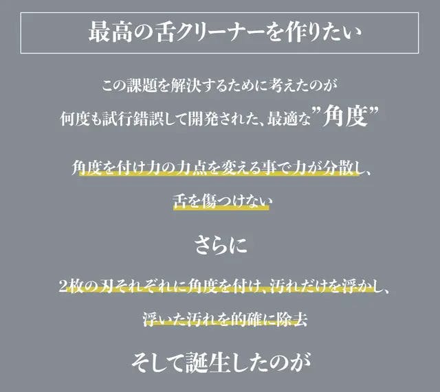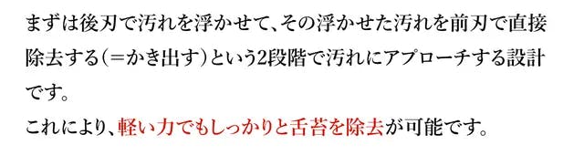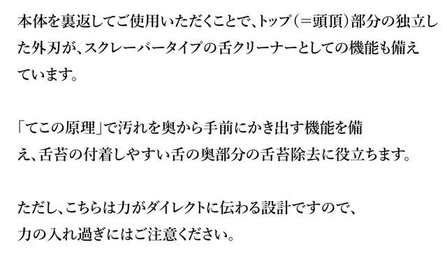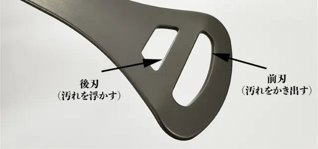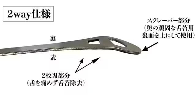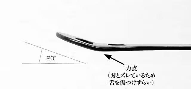 A:内刃の2枚刃のうちの1枚は機械作業に加え、さらに職人による手仕上げでの研磨加工で微細な角度を追加しております。デリケートな舌に触れる部分ですので、非常に微細な加工となっており分かりにくいかもしれませんが、熟練職人の最後のひと手間で微細に確度の違う2枚刃が相互作用をもたらし、優しく汚れを浮かして落とす設計となっております。 なお、仕様の詳細はページ上部の説明文もご参照くださいませ。